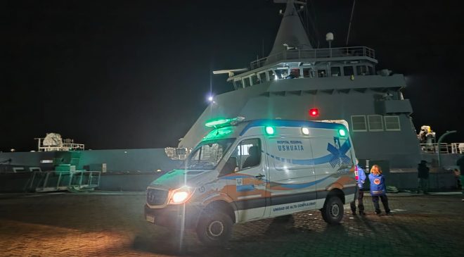 Pasadas las 22, el buque arribó al puerto de Ushuaia y el hombre fue trasladado en ambulancia a la Clínica San Jorge para su atención.
