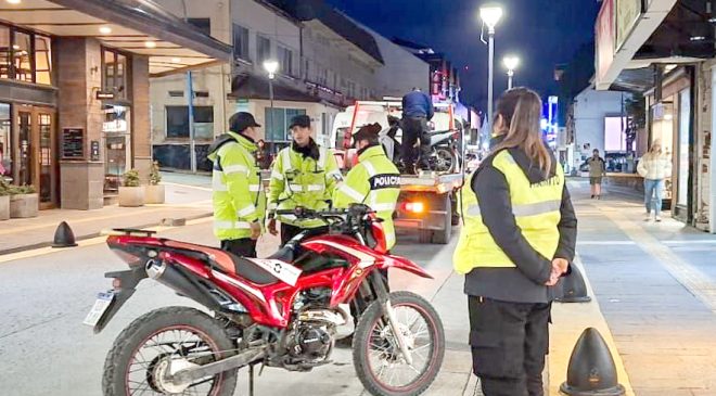 Ushuaia. Durante un procedimiento nocturno realizado sobre la calle San Martín, personal municipal y efectivos policiales verificaron documentación y medidas de seguridad en motovehículos.