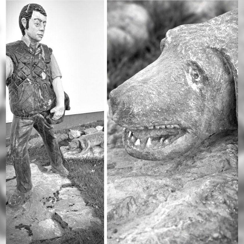 En un gesto de ladrido congelado, exhibe unos caninos blancos, demasiado blancos, demasiado perfectos para tratarse de un animal hecho de cemento y yeso. Hay algo en esa dentadura que desentona, que obliga a mirar dos veces.