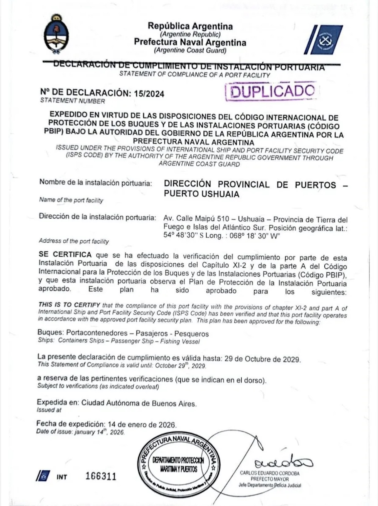 Se trata de la denominada “Declaración de Cumplimiento de Instalación Portuaria”, emitida el 14 de enero de 2026 en el marco del Código Internacional para la Protección de Buques e Instalaciones Portuarias (PBIP). Allí, la autoridad marítima deja constancia de que el puerto opera bajo un Plan de Protección aprobado y dentro de los estándares exigidos para la operatoria internacional.