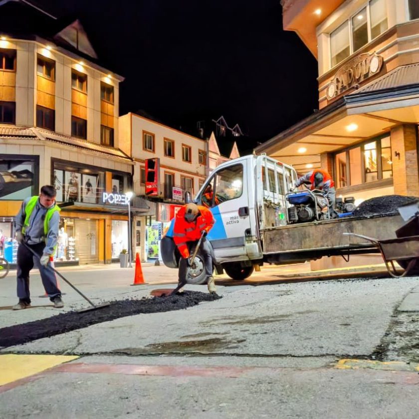Cuadrillas municipales continúan con tareas de bacheo, reparación de cordones y acondicionamiento de espacios públicos en distintos sectores de Ushuaia, en el marco de las acciones de mantenimiento previo a la temporada estival.