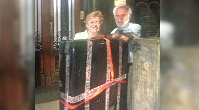 El matrimonio Burucúa, Gastón y Aurora, docente y médica que residieron en Ushuaia en los años 70, escoltan uno de los vitrales, listo para ser despachado a Ushuaia.